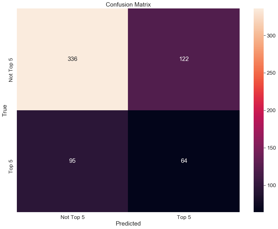 Next, I built a confusion matrix. The model clearly had trouble correctly predicting “Top 5”.
